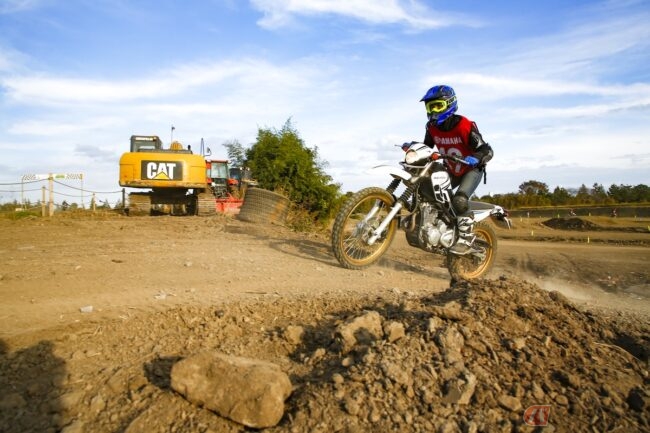 このレッスン会場は、埼玉県川越市にあるオフロードビレッジです。このコースには、ウッドチップで地面を覆われている箇所があり、そのおかげでとてもフカフカしています。地面は硬くはありませんが、一方でとても車体は沈みやすく、よりデコボコした感覚が身体に伝わってきます。