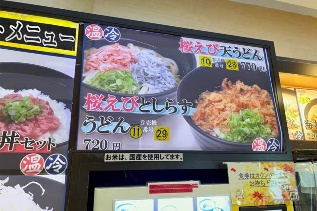 店頭のメニュー写真を見ると、うどんの上に由比名物の桜えび、それにしらすもオンされた「桜えびとしらすうどん」(720円)を発見、オーダーしました。