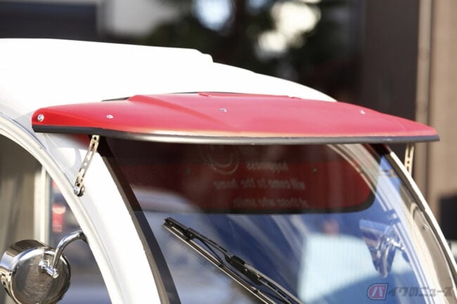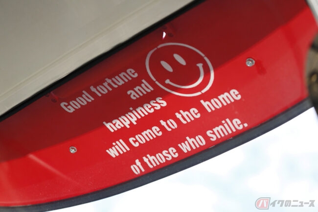 APtrikes125を購入後、コロナ渦はさらに深刻になりましたが、Masakiさんはその期間を利用し外装をコツコツ自分でカスタムしました。大好きなレトロアメリカンをイメージして白と赤のツートンのカラーリングを施し、サンルーフは市販のバイザーをカットし、得意のステンシルでスマイルマークと気持ちの綻ぶメッセージを描きました。