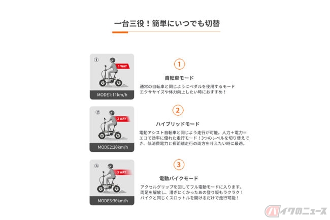 最新モデルであるD1は、折畳自転車のような「コンパクトさ」と「利便性」を兼ね備えながらも、1台3役をこなせる万能型の電動原付モデルで、「バイクモード」「アシスト自転車モード」「自転車モード」の切替を行うことで、使用用途に適切なモビリティとして活用できます。
