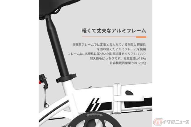 公道を走行する際に必要となる「ヘッドライト」「リアライト」「ミラー」「方向指示器」を備えたD1は、軽量で上部なアルミ製フレームを採用し、JIS基準の耐久試験にもクリア。総重量も18Kgと持ち運び可能な重さに抑えられています。
