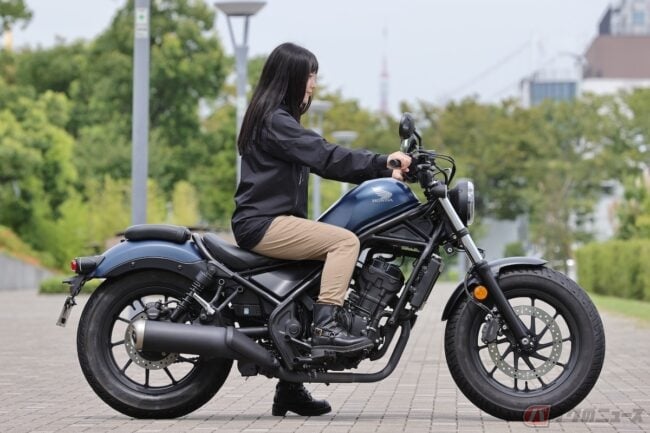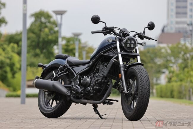 まずひとつ目の車種は、ホンダ「レブル250」です。スリムなボディフレームに相反するようなボリューミーな足回りに加え、むき出しのエンジン機構や、マット&ブラックアウトで統一されたパーツなど、細部まで洗練されたデザインの一台です。