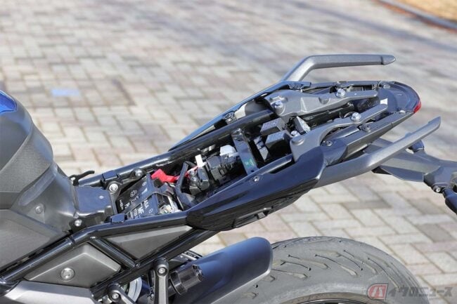 リアシートのすぐ後ろで切り詰められたデザインは、ネイキッドモデルのニューカマー、「トライデント660」と同様の手法で、フロント周りに快適さとタイガー的なスタイルを持たせたフェアリングが特徴となっています。