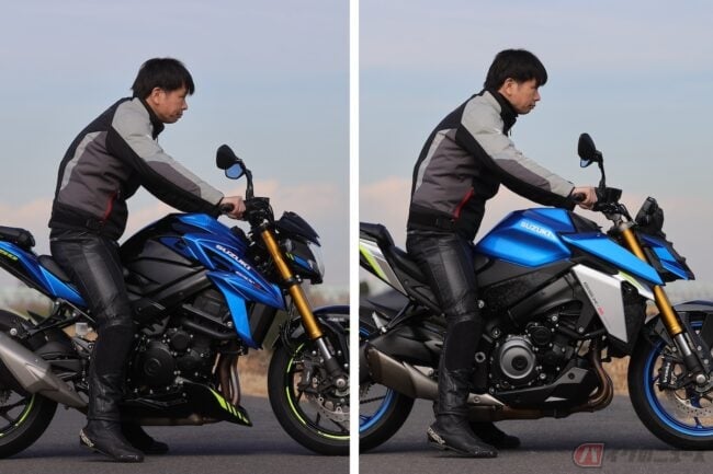乗車姿勢はいずれも上半身が起きて、ゆったりとしたもの。わずかに前傾して、ストリートファイターにふさわしいライディングポジションです。