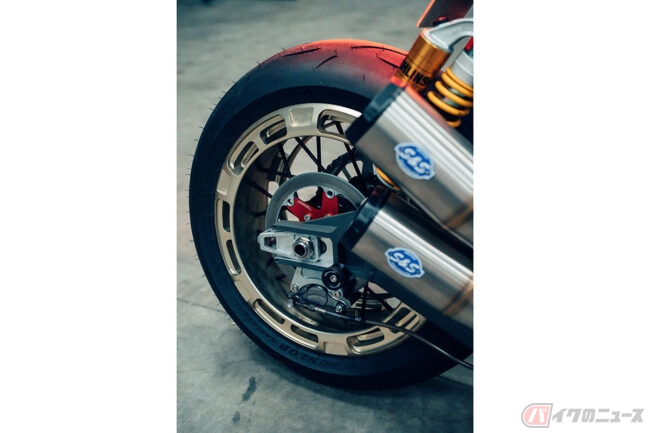 また、FTR AMAではフロント周りにオーリンズ製サスペンションとボルドール製750ccヨークレプリカ(トリプルツリー)、リアにはオリジナルのアルミ製スイングアームとオーリンズ製サスペンションを採用。