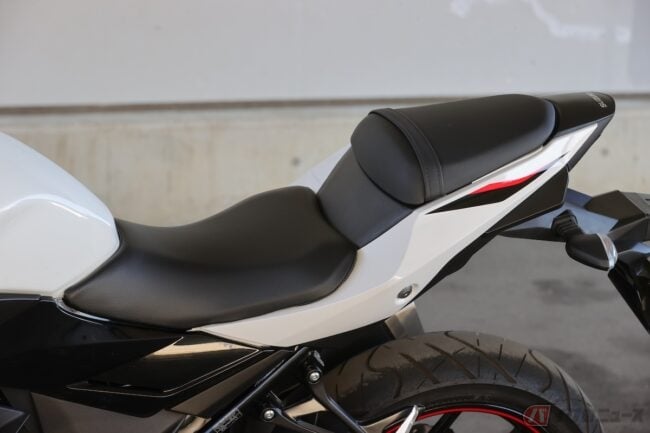 改めて実車を観察すると、写真で見て思っていたよりもサイズ感が大きいことにビックリ。シートがリアタイヤ寄りの結構後ろめに位置していて、運転時に前のめりのポジションになるだろうことがわかる。今回の試乗車のカラーリングは、ホワイトをベースに黒赤が織り混ざることで鋭さが演出されているようなクールなカラーリング。春夏秋冬問わずどんなシーンにも映えそうな色だ。