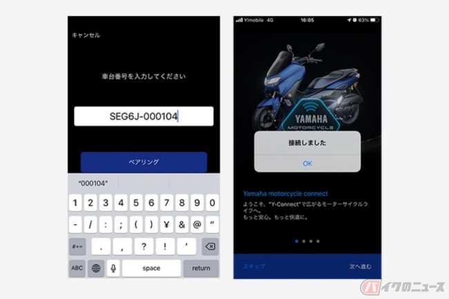 そして次が大切な作業で、スマホとマシンを繋ぐペアリング。Bluetoothと位置情報をオンにして、出てきた画面は「車体番号を入力してペアリング」ともうひとつ、「CCUのQRコードをスキャンしてペアリング」。