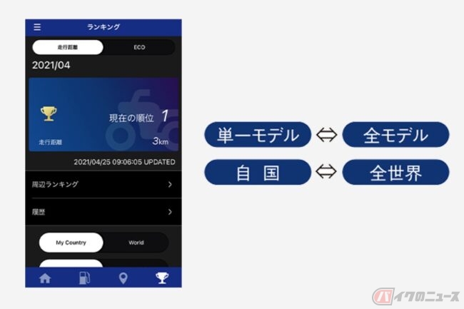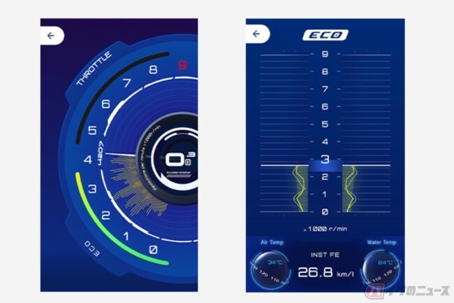 そして次は、レヴズ・ダッシュボード。好みの表示タイプを選べ、エンジンの回転数やスロットルの開け具合、加速度、エコ運転状況、そして瞬間燃費など表示してくれる。ランキング機能も搭載されていて、速さではなく、国内外のY-Connectを使っているユーザーの走行距離やエコ運転の結果が発表されるみたい。