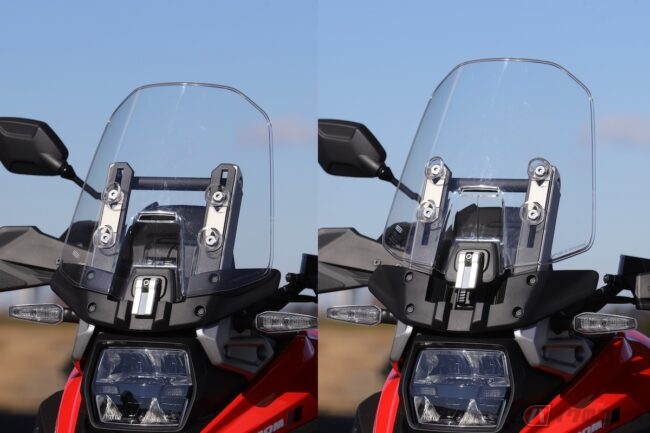 身長のわりには座高がたっぷりとある筆者ですが、ウインドスクリーンを上限まで引き上げても目線のやや下にフチがあり邪魔になりません。それでいて、防風効果がしっかりとあって身体が疲れません。高速巡航を快適にしています。