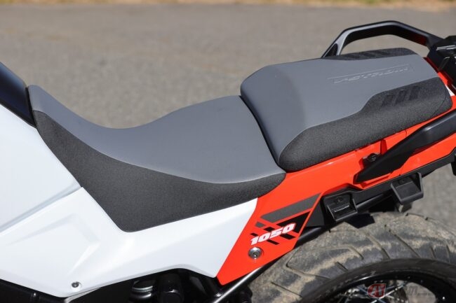 アルミテーパーハンドルバーは広めで、肘が若干張り気味に。シートとステップに距離があり、ヒザの曲がりは窮屈ではなくゆるやか。大排気量アドベンチャーとしては標準的なゆったりとした乗車姿勢で、ロングライドも快適です。