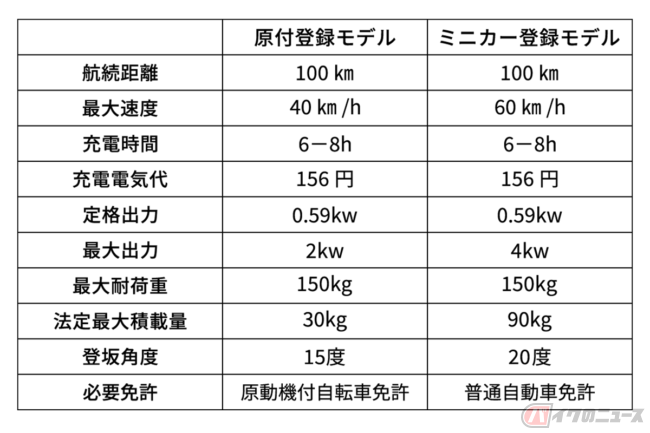 家庭用コンセントからの充電が可能なうえ、一回の充電で約100km(充電走行距離・定地の測定 / 乗員55kg、バッテリー新品、気温25℃、乾燥路面、無風)の走行が可能なEVデリバリーは、これまでミニカー登録可能なモデルのみの販売でしたが、多くの配達員を抱える企業からの「原付免許だけでも運転ができるようにしてほしい」という要望に応え、最大出力2kwに設定した原付登録可能なモデルを追加。