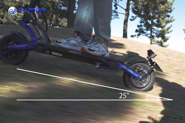 また、坂道を登り切れず途中で止まってしまう電動キックボードは、後続のクルマなどにとって非常に危険です。そこで、MANTIS10には500Wのハイパワーモーターを搭載し、最高25度の坂を上りきることが可能となりました。そのため、坂道の多い場所に住んでいる人でも安心です。