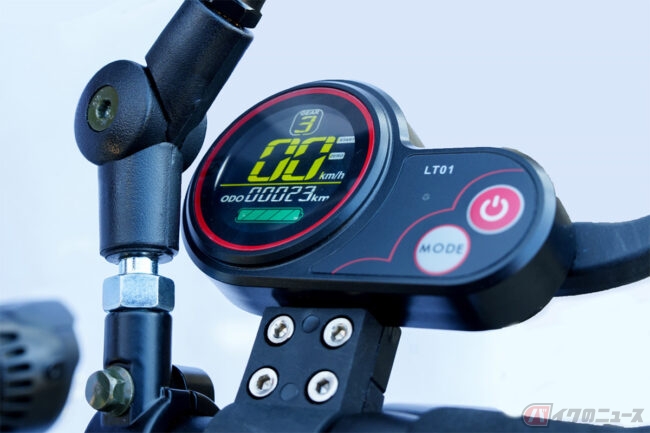 3段階の走行モードで、1段階で時速0㎞から15km、2段階で0㎞から25km、3段階で0㎞から40kmに調節可能。手元のディスプレイで現在のモードが表示されるので、現在どのモードで走行しているかもひと目で分かります。