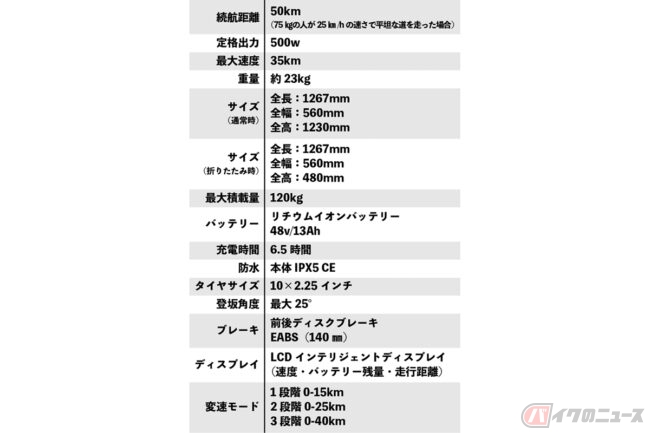 なお、日本の公道走行に必要な、前照灯(LEDヘッドランプ)、後写鏡(バックミラー)、番号灯(ナンバープレート照明灯)、尾灯(テールランプ)、制動灯(ブレーキランプ)、後部反射器(リフレクター)、警音器(ホーン)、速度計(スピードメーター)、ナンバープレート取付板などの保安部品も標準装備。折りたたんでコンパクトになるので、玄関に置いたりクルマに積んで移動するにも便利です。