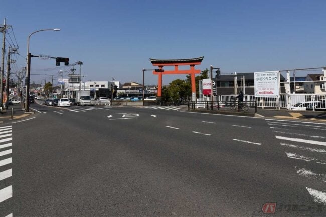 国道1号を横切り、鳥居をくぐって「鶴嶺八幡宮」の参道を進みます。突き当たって「鶴峰八幡宮前」交差点を右に曲がると、目的のお店「伊勢屋」に到着です。