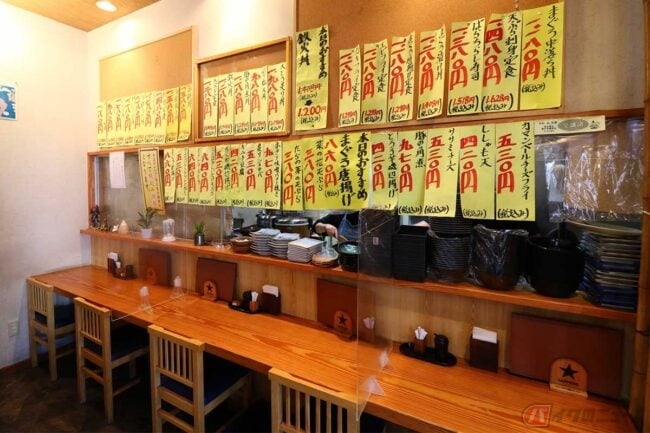 お店に入ると、カウンター席とテーブル、座敷の席があります。テーブル席につき、筆者はKさんが大絶賛する「アジフライ定食」を、Kさんは人気メニューの「特選海鮮丼」をオーダーします。