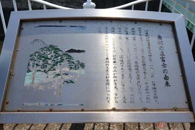 この左富士という名称ですが、国道1号(東海道)と交わる「鳥井戸橋」交差点から見える富士山が、国道1号の左側にあることからそう名付けられたそうです。東京(日本橋)から大阪(梅田新道)までの730km、京都(三条大橋)までの490kmの間で、富士山が東海道の左側に見えるのは旧東海道も含め3カ所あり、その内のひとつだとか。交差点には「南湖(なんご)の左富士之碑」が建てられています。