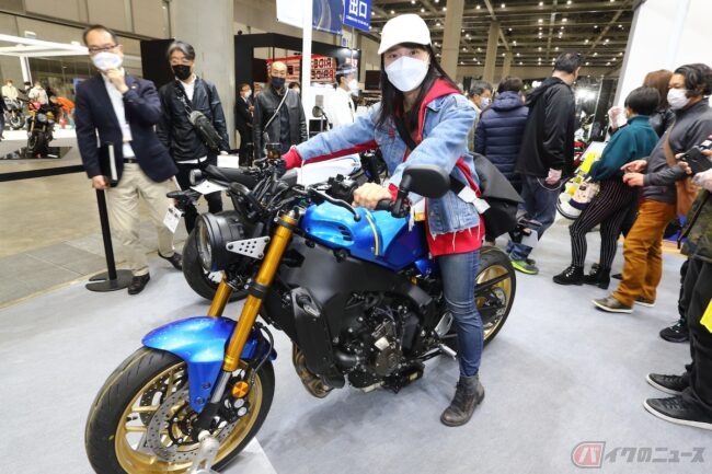 ヤマハのブースで真っ先に私の目に飛び込んできたのは「XSR900」でしす。今春発売予定らしく、私以外にもたくさんの方が注目されているので、「XSR900」の周りには人だかりが…! 過去に「XSR900」を試乗したことがあるのですが、この最新モデルは私の中にある「XSR900」のイメージと全然違ったカラーリングで、美しいヤマハブルーがメインのデザイン!