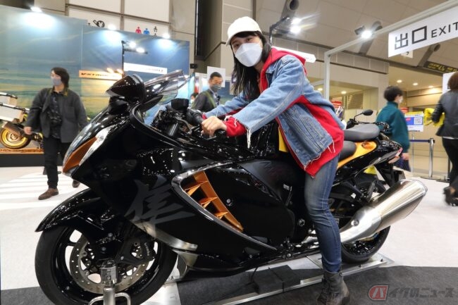 次にスズキブースへ。私がずんずんと向かった先にあるのは「隼」!やっぱり憧れますよね~ ホワイトとブラック両方跨っちゃいました(笑)
