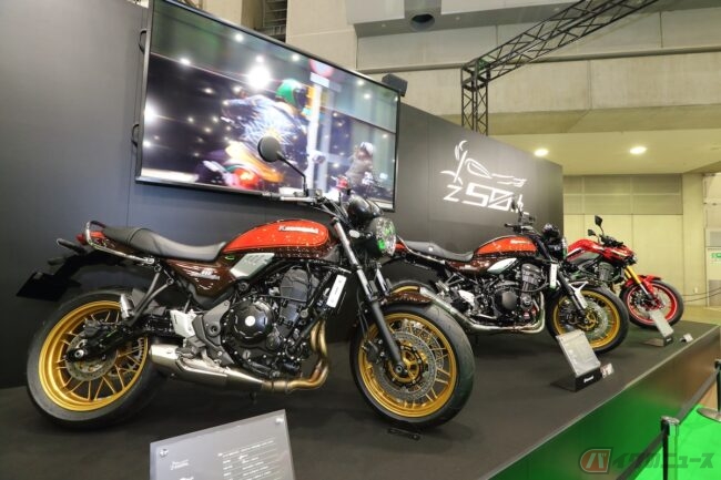 同じH2シリーズの最新モデルがここで飾られており、生で見ることができて興奮します。ちょっと高い台に飾られているのが、孤高の存在のよう。私はバイクの塗装にも目が行きがちなのですが、この「Ninja H2 SX SE」の発色の良い緑と黒の輝きが見事で、ずーっと眺めていたいほど(笑) 大袈裟でなく、ラメも入っていてちょうどいい派手さを兼ね備えていてH2ならではのオーラを放っていました。
