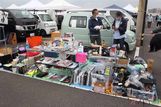 その光景は何となくアメリカのロングビーチのスワップミートを思い起こさせる感じだったのですが、当日の天候は残念ながら曇天模様。しかも予報では午後から「大荒れ」という情報だったゆえ、当日の来場を躊躇した人も多かったのかもしれませんが、結果としては時折、強風が吹きつつも天候も持ち、つつがなくイベントが執り行われた模様です。