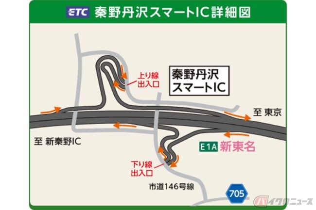 同区間にある秦野丹沢SAには「秦野丹沢スマートIC」が併設されていますが、まずはスマートICが先行して開通。現状での終点となる新秦野ICは国道246号線へつながっており、東名の大井松田ICまで約5kmの距離となっています。