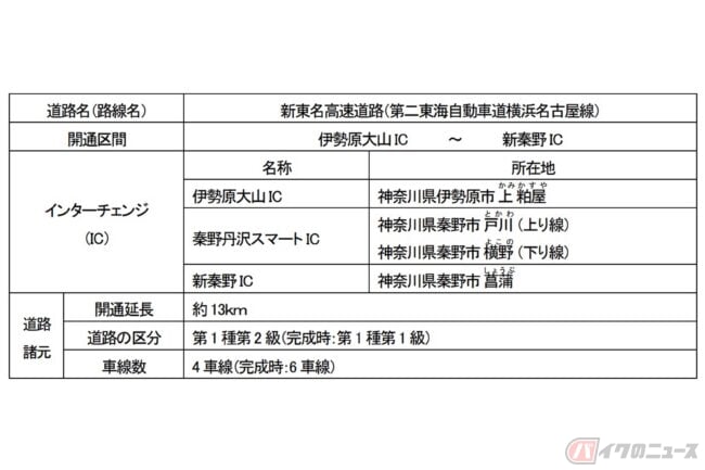 NEXCO中日本は、新東名高速道路(新東名)の伊勢原大山インターチェンジ(IC)~新秦野ICまでの間を2022年4月16日(土)15時に開通。この延伸にあわせ、秦野市とNEXCO中日本で建設を進めてきた秦野丹沢スマートICと、国土交通省関東地方整備局が建設を進めてきた国道246号秦野IC関連事業も同時に開通します。