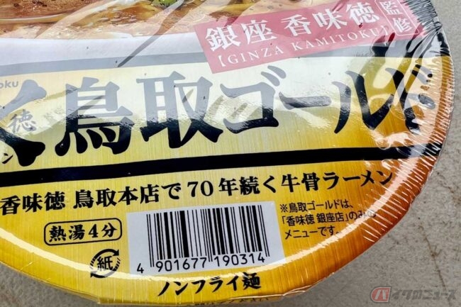 モデルとなったラーメンは、鳥取県中部で創業した、70年の歴史を持つ老舗『香味徳(かみとく)』から、東京銀座にある『香味徳銀座店』が監修しています。カップ麺の蓋には、「鳥取ゴールド」は『香味徳銀座店』だけでしか食べられないメニューだと記されています。牛骨出汁の甘さとコク、透き通ったゴールドのスープが特徴とのこと。