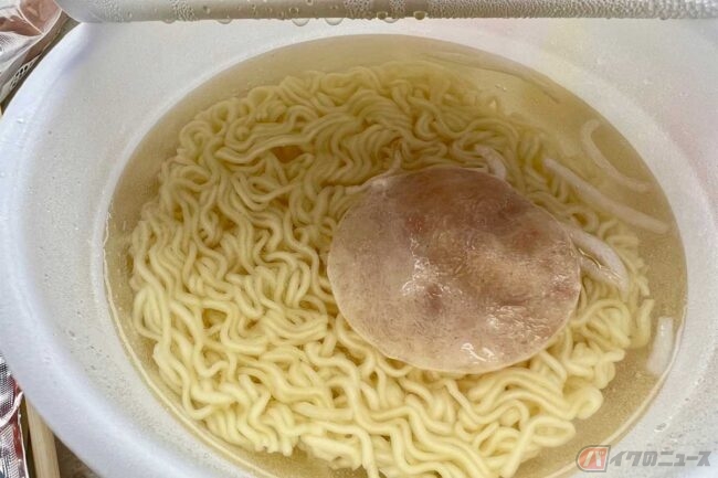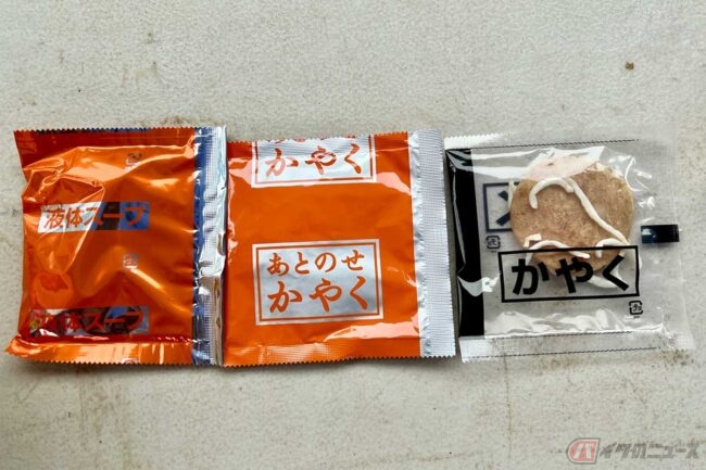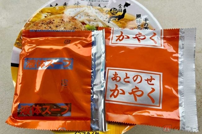 開封してみると、中には液体スープ、あとのせかやく、かやくの3種類の小袋が入っています。早速、熱湯を注いで食べてみました。
