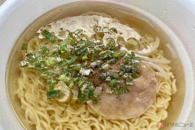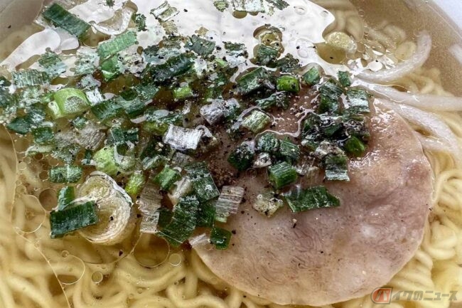 かやくの具材はチャーシューとモヤシ、あとのせかやくはネギとブラックペーパーです。透き通ったスープに黒胡椒という見た目が良く、味にも良いアクセントになっていました。総じて、満足な味わいのカップ麺でした。