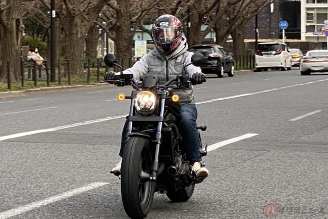 モードに合わせたエンジンサウンドを全身で感じながら、景色と音と振動を味わえるレブル1100。姿勢も前傾じゃないし、シート位置も低めやから足つきも良く、長~く乗っても疲れない。