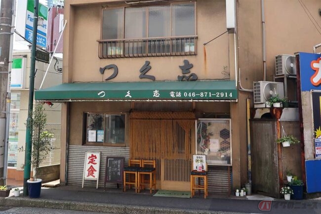 駐輪場から徒歩で今回の目的地に向かいます。「新逗子通り」を京浜急行「逗子葉山駅」方向に向かうと、看板が見えてきました。昭和26年創業という老舗の居酒屋「つく志(つくし)」です。筆者が何度か訪れているお店で、何を食べても美味しいのです。アジフライも人気があるということで期待いっぱいです。