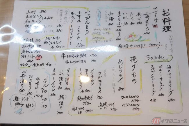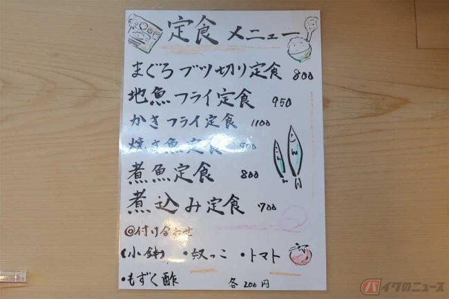 昼の定食にアジフライはありませんが、アジを含め、その日に入荷した魚のフライの盛り合わせ「地魚フライ定食」を注文します。4代目店主の藤枝さんは、ホンダ「スーパーホークIII」や、カワサキ「ゼファー」などに乗っていたことがあり、今は「スーパーカブ」を所有しているそうです。懐かしいバイクの話をしつつ、手際よくフライを揚げていきます。数分で「地魚フライ定食」がやってきました。