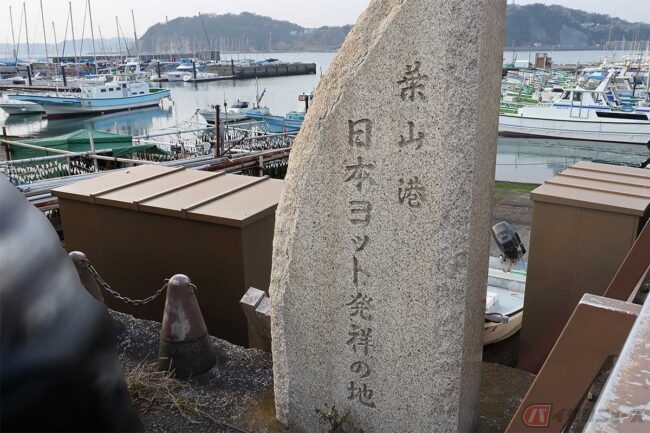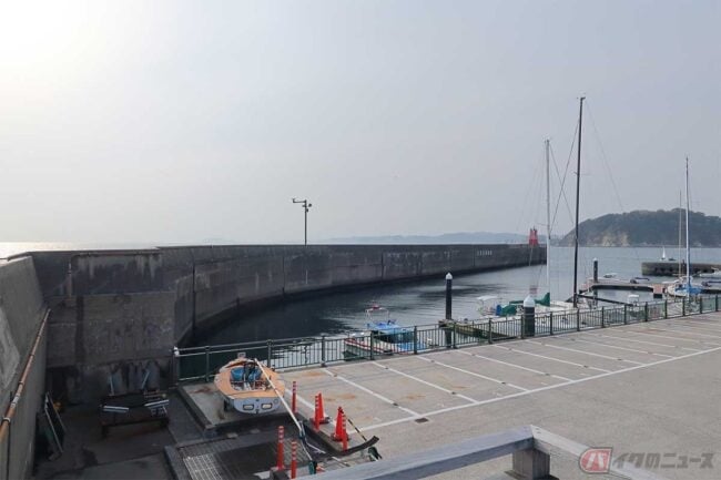 食後は、店主の藤枝さんから教えていただいた葉山マリーナ近くの堤防へ行ってみます。駐輪場から「CT110」を出して海岸沿いに葉山町へ移動し、鐙摺(あぶずり)漁港の先にある「はやま港海の駅」の前にバイクを停めて、駐車場を通り抜けて堤防に向かいます。