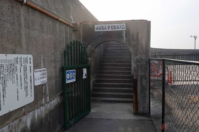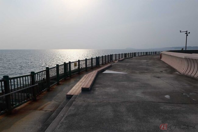 「防波堤A・防波護岸」というのが正式名称なのでしょうか、アーチを潜って階段を上がると、そこは視界いっぱいに海が広がっているではないですか! そのまま先端まで歩きます。びっくりするくらい開放的で気持ちの良いロケーションです。途中には何カ所もベンチがあり、のんびりするにも良さそうです。