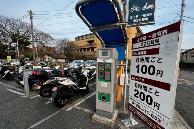 駅や市役所に近い「逗子駅一般有料第2駐輪場」にバイクを停めました。駐輪場は原付(50cc)から原付2種(125cc未満)に限定している場合が多いですが、ここは排気量の制限がありません。とは言っても駐車枠はそれほど大きくないので、大型車には不向きです。