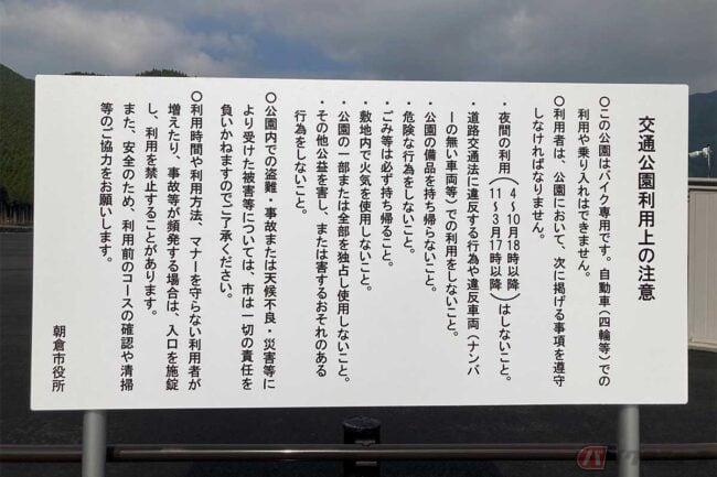 「バイクを対象にした交通公園は、西日本では少ない。福岡県宮若市に1コースを備えた交通公園がありますが、広く九州管内から目指して来てくれるようです。ぜひ朝倉市にも来ていただきたい。少し足を伸ばして地元の原鶴温泉を利用していただき、地元の活性化を狙えないか、とも考えています」
