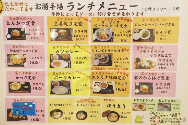 お腹も空いてきたところで、レストラン「お勝手場」に向かいます。ここは地産地消にこだわったお店で、地元の食材を活かした魅力的なメニューが並んでいます。その中で気になったのが、「富士湧水ポーク」を使ったメニューです。この豚肉は都留市のミネラル豊富な富士の湧水で育ち、一定の条件を満たした豚だけに与えられるブランド呼称で、あまり出回っていないことから“幻のブランド豚”と呼ばれているとか。柔らかい肉質に加えて旨味とコクのバランスが取れた、とても美味しいお肉とのこと。