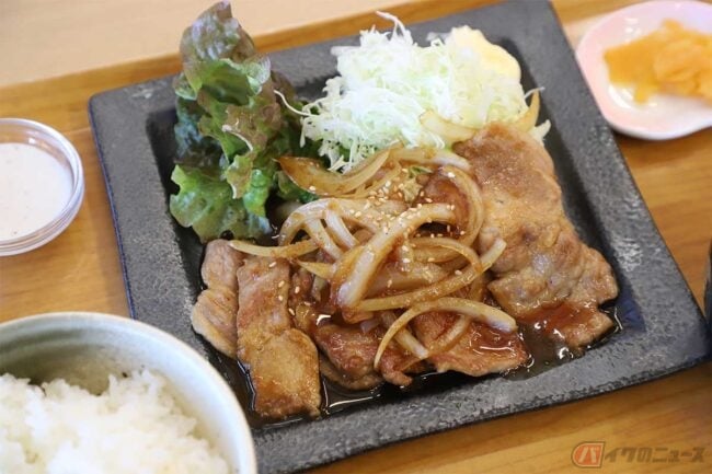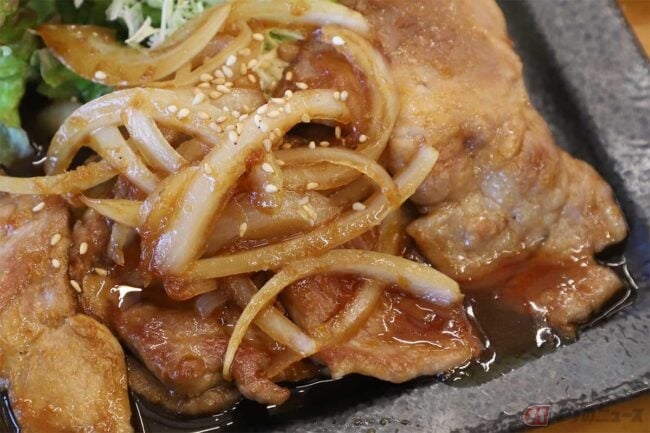 待つこと数分、料理がやってきました。しょうがと醤油の香ばしい匂いが周囲に漂い、お腹が鳴ります。お肉の部位は赤身と脂身のバランスが良い肩ロース肉とのこと。豚肉はやや大ぶりにカットされており、たまねぎも多めでボリュームがあります。