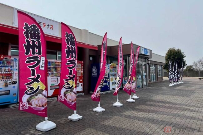 ツーリング途中で兵庫県加東市に位置する中国自動車道「社(やしろ)PA」(下り)に立ち寄ったところ、この地域のご当地ラーメンが大々的にアピールされていました。食堂も売店も「播州(ばんしゅう)ラーメン」一色です。