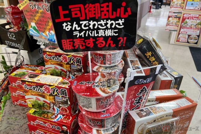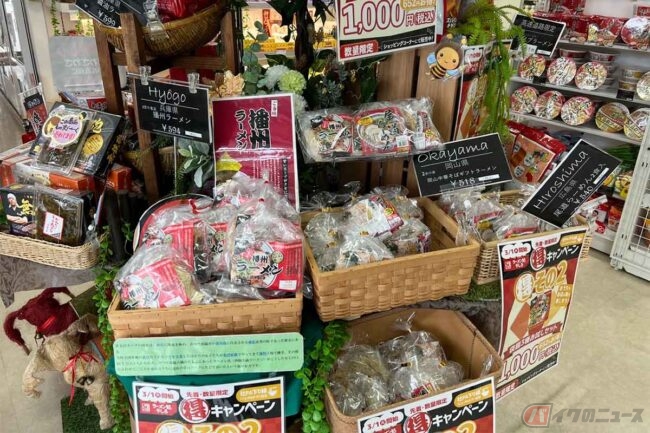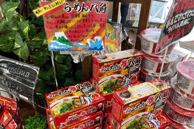 食後に売店を覗いてまたびっくり。播州ラーメンを全面に押し出した陳列で、袋麺や兵庫県西エリアで有名な「らーめん八角」、「あまくち醤油麺」のカップ麺などが販売されていました。よく見ると「尾道らーめん」などもあり、まさにラーメン推しのPAだったのです。