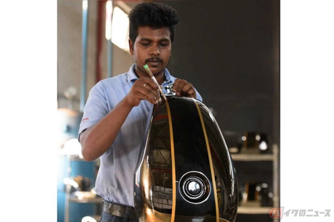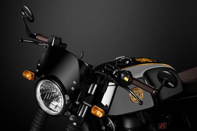 ブラッククロームのカラーリングと真鍮製のタンクバッジが特徴的なアニバーサリーエディションは、120年にわたるブランドの豊かな歴史を記念して構想されたもので、英国とインドの合同チームによってデザイン・製造されました。