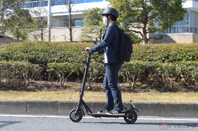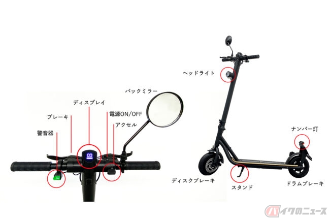 大型化したバックミラーやフロントにディスクブレーキを備えたMF-EKRA01S-BKは、約4時間の充電で約30kmの走行が可能で、8.5インチのノーパンクタイヤを採用。