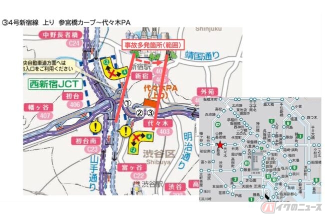 首都高バイク事故多発ポイントを知る 〜4号新宿線 上り 参宮橋カーブ~代々木PA〜