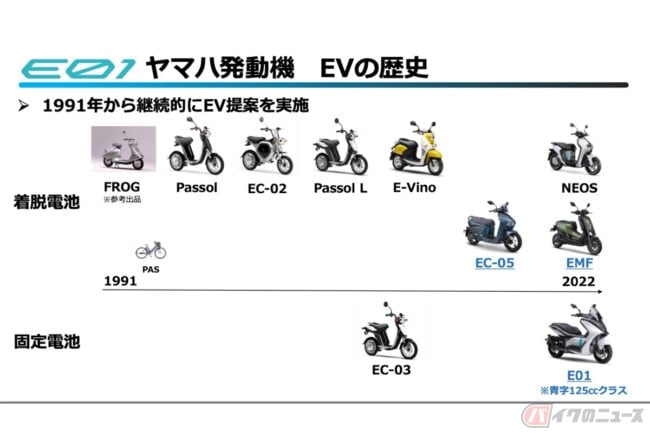 ヤマハは1991年の東京モーターショーで『FROG』を参考出品して以来、2002年に発売した『Passol』をはじめ、『Passol L』(2003年)や『EC-02』(2005年)、『E-Vino』(2015年)など継続的に電動二輪車を提案・開発し、市販化してきました。