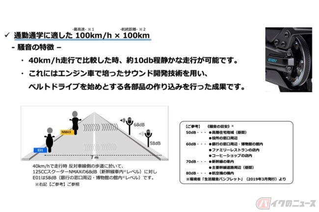 40km/h走行時に反対車線側の歩道上に及ぼす音量は、『NMAX』では68dBであるのに対し、『E01』は58dBでしかありません。