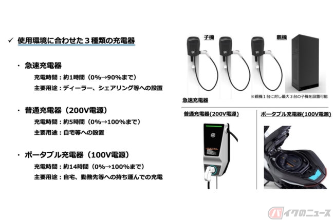 バッテリー充電は「急速充電器」「普通充電器」「ポータブル充電器」の3つの充電システムに対応し、使用環境や用途に応じて選べます。