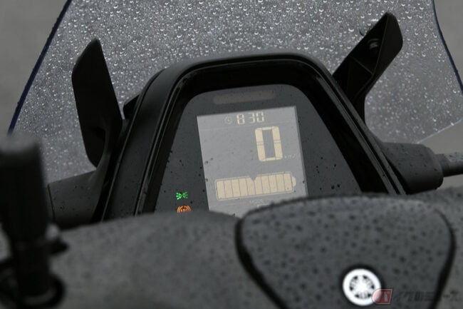 自社開発し、組み立てた車両固定型バッテリーの容量は4.9kWhで、満充電でおよそ104km走行可能。CFアルミダイキャスト製のバッテリーケースに収め、『NMAX』と同等の車体サイズや足つき性を確保しています。