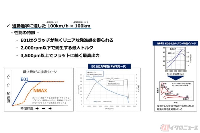 1950rpmで最大トルク30Nmを発生し、3500rpm以上ではフラットなまま立ち上がっていくヤマハ『E01(イーゼロワン)』もまた発進加速に優れ、低中速域を得意にしたスムーズな走りを味わうことができました。