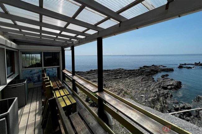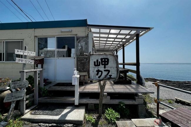 食後は、お店から国道127号を南に戻ります。金谷港フェリー乗り場を過ぎて館山方面に5分ほど走ると、海側に横道があります。すぐに行き止まりになる道なのですが、ここに素敵なカフェがあるのです。海に面した岸壁の上に建つ「音楽と珈琲の店 岬」です。